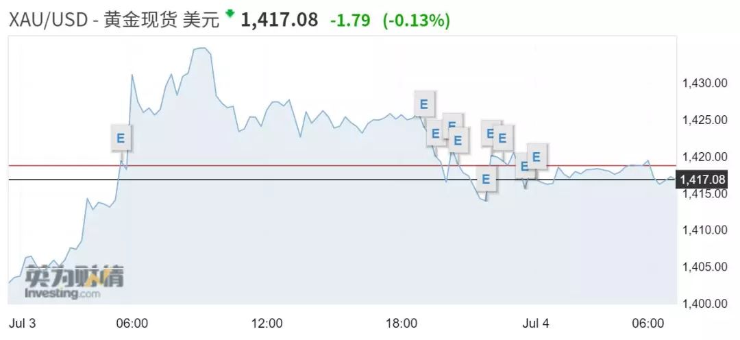 美市盤中,現貨黃金短線一度拉升逾7美元,至1420.90美元/盎司,但隨后很快回落至平盤以下。