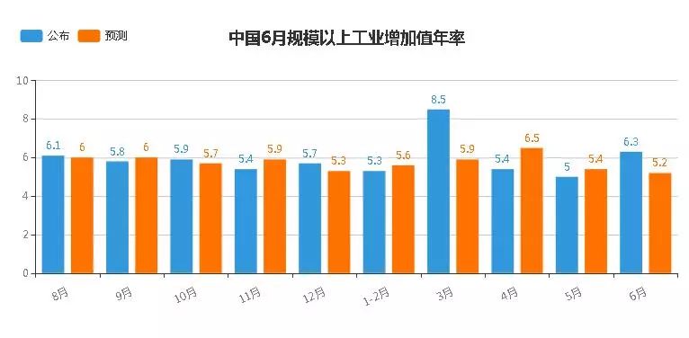 數據方面:周一國家統計局公布的中國6月份工業產值同比增長6.3%,超過5.2%的預期;1-6月份固定資產投資同比增長5.8%,超過分析師5.5%的預期,詳見下圖: