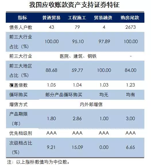 普通貿易類、貿易融資類、購房尾款類應收賬款資產支持證券占比較高 法律意義上的應收賬款可定義為企業在經營過程中因銷售商品、提供勞務等形成的債權,因此廣義應收賬款資產支持證券主要可分為普通貿易類、貿易融資類[1]、購房尾款類、工程施工類等。從發行規模占比來看,2006年~2016年及2017年上半年,普通貿易類應收賬款資產支持證券共發行24單,發行規模377.60億元,在各類產品中占比最高;貿易融資類、購房尾款類資產支持證券發行規模分別占據第二、三位。 Number 2 應收賬款資產支持證券信用風險比較分析 從應收賬款資產支持證券細分類型來看,普通貿易類、貿易融資類、購房尾款類和工程施工類應收賬款資產支持證券在基礎資產和交易結構等方面的信用風險特征有所不同。由于普通貿易類、貿易融資類和購房尾款類發行規模占比較大,下文將主要分析上述三類資產支持證券的信用風險特征。 (一)普通貿易類應收賬款資產支持證券 普通貿易類應收賬款資產支持證券為以生產貿易類企業因銷售貨物或服務對其下游客戶的應收賬款作為基礎資產的資產證券化產品。截至2017年6月末,存續期內普通貿易類應收賬款資產支持證券共有19單,余額為216.50億元。 普通貿易類應收賬款資產支持證券基礎資產債務人信用資質分化較大,部分債務人屬于強周期或資金周轉時間較長行業,基礎資產現金流回收時間具有一定不確定性 根據已披露產品相關信息(4單),普通貿易類應收賬款資產支持證券的入池資產加權平均信用等級分布于BB/BB-~AAA之間[2],債務人信用資質分化較大。 根據已披露產品相關信息(12單),普通貿易類應收賬款資產支持證券的基礎資產債務人分布于醫院、貿易、建筑、鋼鐵、基礎設施建設、電子等行業,前三大行業為醫院(占比31.67%)、建筑(占比24.09%)和鋼鐵(13.07%)。部分產品的債務人屬于強周期行業,其經營財務情況易受宏觀經濟和行業供需情況波動影響;在產能過剩、行業內競爭激烈的情況下,其盈利能力、現金流情況、償債能力將可能有所惡化,從而影響基礎資產逾期和違約情況。 另一方面,部分原始權益人的下游客戶(例如醫院等)資金占用時間較長,且原始權益人相對下游客戶較為弱勢,從而導致原始權益人應收賬款的回款周期較長。根據公開資料,部分產品的入池資產加權平均剩余期限、結算周期和對應債務人歷史欠款時間較長,進一步反映了相關行業下游客戶占用資金,回款周期較長的特點[3]。 普通貿易類應收賬款資產支持證券的基礎資產尚未出現違約,但基礎資產無抵質押和保證擔保增信,逾期資產回收對債務人自身支付意愿和能力依賴程度很高 從已發行產品存續期表現來看,個別產品(三一重工-中泰光大2016年1期應收賬款資產支持專項計劃[4]、五礦發展應收賬款資產支持專項計劃[5])基礎資產在存續期內出現少量逾期現象,不過資產支持證券本身尚未構成違約。 與CLO、消費貸、租賃債權等資產證券化產品的基礎資產相比,應收賬款通常無抵質押和保證擔保,且原始權益人對于下游客戶通常處于弱勢地位,催收效果不佳,逾期資產的回收完全依賴于債務人自身的支付意愿和能力。 由于債務人所處行業與原始權益人主營業務關聯性較強,普通貿易類應收賬款資產支持證券行業集中度普遍較高,基礎資產現金流易受行業波動影響 由于基礎資產債務人所處行業為原始權益人下游行業,普通貿易類應收賬款資產證券化產品的行業集中度普遍偏高。根據已披露產品相關信息,普通貿易類應收賬款資產證券化產品的前三大行業OPB占比分布于77.16%~100.00%之間,遠高于CLO、租賃債權等債權類產品的平均值。入池資產行業集中度高將導致普通貿易類應收賬款資產支持證券基礎資產現金流易受債務人所屬行業周期性和政策性波動影響。 普通貿易類應收賬款資產支持證券采用折價購買、信用觸發機制和外部增信等交易結構安排,可緩釋基礎資產無利息流入、回款時間和金額不確定性強等風險 由于基礎資產無利息流入而證券端需支付利息,與其他債權類資產支持證券不同,應收賬款資產支持證券的初始入池資產未償本金余額一般大于產品發行規模,初始覆蓋倍數分布于1~1.42倍之間,以1~1.1倍之間的產品居多。覆蓋倍數高低與基礎資產信用質量、對應債務人歷史回款情況等因素有關。 由于下游客戶經營情況和現金流充裕情況、產業鏈上下游地位等因素,應收賬款合同對于回款時間并無很強約束力,應收賬款回收時間存在不確定性,部分行業客戶拖欠賬款現象較為普遍。由于產品質量問題、下游客戶要求返點等因素,應收賬款的實際回款金額可能低于初始入池金額。 基于上述原因,應收賬款資產證券化產品在交易結構設計方面一般通過較為嚴格的內外部增信機制緩釋上述風險。常見的內部增信措施包括權利完善事件、加速清償事件和違約事件、與資產服務機構主體級別關聯的回收款轉付機制、不合格/滅失資產贖回等;外部增信措施包括原始權益人或關聯方差額支付、關聯方擔保等。部分產品因原始權益人的出表需求未設置差額支付或擔保,本息能否如期足額償付更多地取決于基礎資產自身質量。 2017年下半年普通貿易類資產支持證券信用質量仍將保持穩定,但需關注行業風險對基礎資產現金流和原始權益人履約能力的影響 市場已發行的普