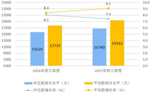 ▲2017年前三季度居民人均可支配收入平均數與中位數(圖片來源:國家統計局官網)