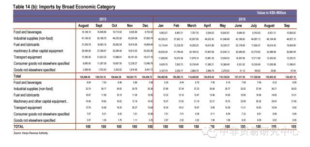2016年前9個月,肯尼亞主要進口產(chǎn)品類別是:食品及飲料、工業(yè)用品、燃料及潤滑劑、機器及其它固定設(shè)備、交通設(shè)備、生活消費品(其它類別未列)。