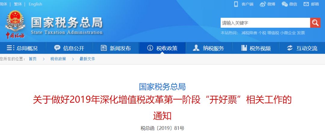 稅總函〔2019〕81號國家稅務總局《關于做好2019年深化增值稅改革第一階段“開好票”相關工作的通知》: