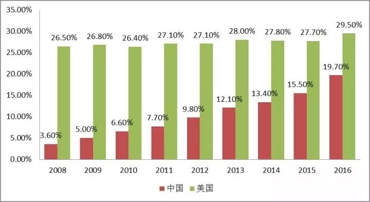 個人消費貸款ABS的爆發(fā)式增長昭示國內(nèi)消費金融資產(chǎn)證券化市場的發(fā)展前景廣闊,據(jù)波士頓咨詢近期發(fā)布的一份數(shù)據(jù)顯示,從2017年到2020年,中國消費貸款余額年均復合增長率是20%-24%,2020年預計達到14萬億人民幣,消費信貸市場潛力巨大。近十年,中國消費信貸占消費支出比例逐年增加。截至2016年末,中國消費信貸占消費支出比例已經(jīng)達到19.70%,較美國低9.80%,差距進一步縮小,消費金融ABS市場將繼續(xù)保持快速發(fā)展。