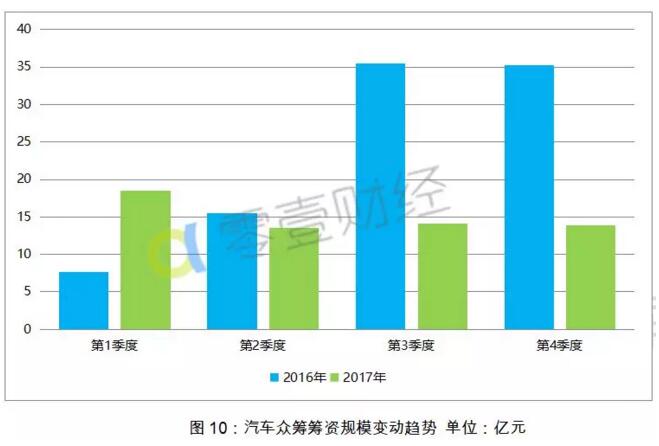 圖10展示了近兩年汽車眾籌歷史籌資規(guī)模變動趨勢,2016年第4季度至2017年第3季度,汽車眾籌籌資規(guī)模逐季減少;除第1季度外,2017年2-3季度籌資規(guī)模均同比大幅下降,2017年第3季度、第4季度同比降幅分別高達(dá)60.3%和60.5%。2017年全年籌資規(guī)模約60億元,同比下降36.0%;截至2017年年末,歷史累計(jì)籌資規(guī)模約161億元。