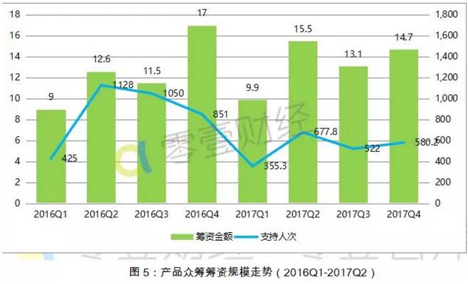 從項(xiàng)目數(shù)量和籌資金額看,科技類眾籌主要表現(xiàn)為產(chǎn)品眾籌,京東眾籌、淘寶眾籌、小米眾籌和蘇寧眾籌是發(fā)布此類項(xiàng)目最多的平臺。根據(jù)零壹數(shù)據(jù)不完全統(tǒng)計(jì),2017年科技類眾籌融資規(guī)模約28億元,同比減少了10.7%;產(chǎn)品型科技類眾籌和股權(quán)型科技類眾籌規(guī)模分別有27億元和1億元。