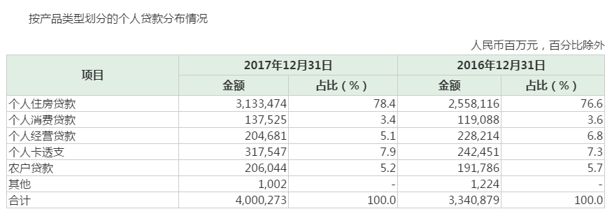 在個貸方面,2107年,農(nóng)業(yè)銀行個人貸款40,002.73億元,較上年末增加6,593.94億元,增長19.7%,主要是由于該行積極支持個人住房、個人綜合消費等民生領(lǐng)域信貸需求,個人貸款實現(xiàn)較快增長。