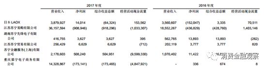 除了蘇寧金融,蘇寧旗下涉及金融業務的聯營企業有蘇寧消費金融和蘇寧銀行。蘇寧消費金融2017年營業收入為3.83億元,同比增長262.75%;其2016年凈虧損1.89億元,2017年扭虧為盈,凈利潤為2.16億元。成立于2017年6月的蘇寧銀行2017年營業收入、凈利潤分別為1.39億元、18.9萬元。