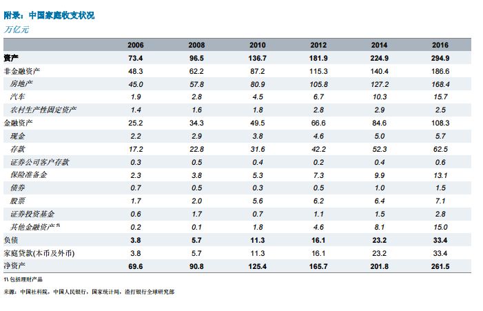 此外,依據中國社科院數年前發布的中國政府和家庭資產負債數據顯示,目前中國家庭部門收支狀況在總體上仍顯穩健。基于中國社科院的方法并采用了更為保守的假設,以下發表我們對 2016 年中國家庭資產負債表的測算(圖表 14 和附錄1):