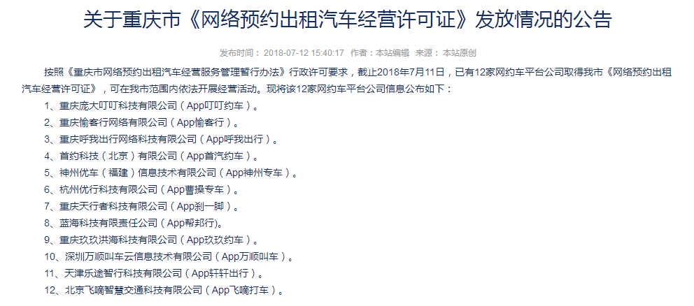 而在重慶,8月的新聞報道中也曾出現滴滴司機因為平臺在重慶未取得《網絡預約出租汽車經營許可證》而遭受處罰。根據重慶道路運輸網的披露數據顯示,截至7月12日,共有12家平臺獲得經營許可,目前暫未披露新增平臺。