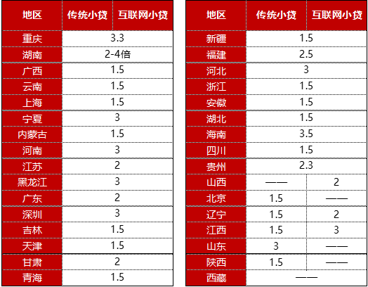 互聯網小貸公司設立地點選擇無監管限制,但應優先選擇政策較開放地區。小貸公司是由各地方金融辦審批設立,而各地小貸公司政策也不盡相同,所以在選取互聯網小貸公司設立地點或收購互聯網小貸牌照時要充分調研當地政策,在全國性的互聯網小貸新規尚未出臺之前,各地區互聯網小貸的融資杠桿情況可參見下表。