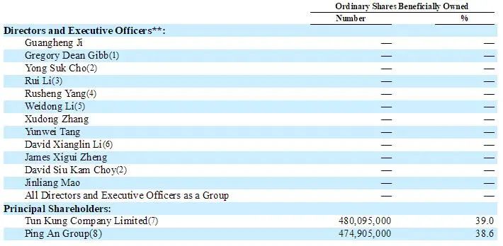股東方面,代表英屬維爾京群島公司Tun Kung Company Limited持有的480,095,000股普通股。Tongjun Investment Company Limited和Lanbang Investment Company Limited分別擁有Tun Kung Company Limited已發行股本和未發行股本的41.0%和37.4%。Mr. Wenwei Dou和Ms.Wenjun Wang分別持有Tongjun Investment公司50%股權,Mr. Xuelian Yang and Mr. Jingkui Shi分別持有Lanbang Investment公司50%股權。代表香港公司安科科技有限公司持有持有的2.85億股普通股及香港中國平安海外保險(控股)有限公司持有的189,905,000股普通股。安科科技有限公司是深圳平安金融技術咨詢有限公司的全資子公司,該公司由中國平安保險(集團)有限公司全資擁有。文件還披露,截至2021年2月22日,美國一位記錄持有人共持有307,407股普通股,約占其流通股總數的0.03%。