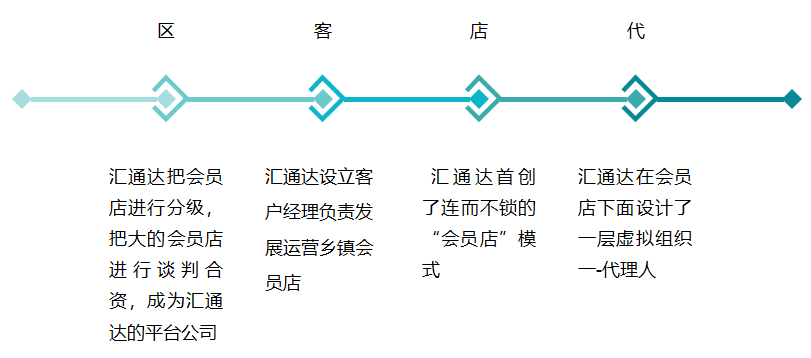 品類增加、規模擴張,這個體系的管理難度也不斷增加,現在350個平臺公司,管理36000多個會員店,每月還以5000個的速度新增會員店。在會員店這一層級,匯通達又增加了「中心店」。