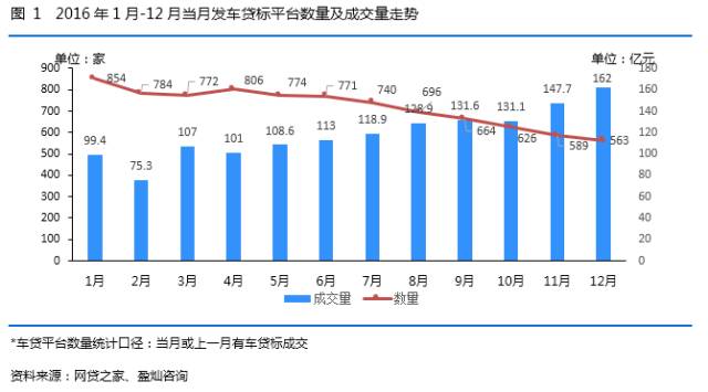根據(jù)網(wǎng)貸之家及盈燦咨詢(xún)數(shù)據(jù),受到行業(yè)整體洗牌的影響,2016年車(chē)貸平臺(tái)數(shù)量走勢(shì)出現(xiàn)下降,截至2016年12月,車(chē)貸平臺(tái)數(shù)量為563家,較年初出現(xiàn)較大的下滑。然而,車(chē)貸平臺(tái)的成交量卻保持了高速增長(zhǎng),2016年全年成交約1424.5億元,占行業(yè)總成交5.1%。說(shuō)明隨著行業(yè)的良性洗牌,車(chē)貸平臺(tái)的成交量正在趨于集中,贏家通吃的局面正在顯現(xiàn)。