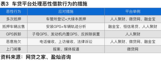 貸后管理中最令平臺(tái)頭疼的是逾期管理,這將使得平臺(tái)不得不面對(duì)難纏的惡性借款行為,表3羅列了車(chē)貸平臺(tái)處理上述行為的常規(guī)措施。可以看到微貸網(wǎng)、人人聚財(cái)在處理這方面問(wèn)題的經(jīng)驗(yàn)相對(duì)豐富。如為了應(yīng)對(duì)借款人的多次抵押,人人聚財(cái)要求借款人在車(chē)管所進(jìn)行質(zhì)押登記并質(zhì)押機(jī)動(dòng)車(chē)登記證書(shū),同時(shí)還會(huì)根據(jù)借款人的信用情況,判定是否進(jìn)行反GPS拆除裝置的安裝。另外,人人聚財(cái)也會(huì)安排專(zhuān)員負(fù)責(zé)車(chē)輛軌跡的監(jiān)測(cè)和分析,以預(yù)防及應(yīng)對(duì)惡性借款行為的發(fā)生。