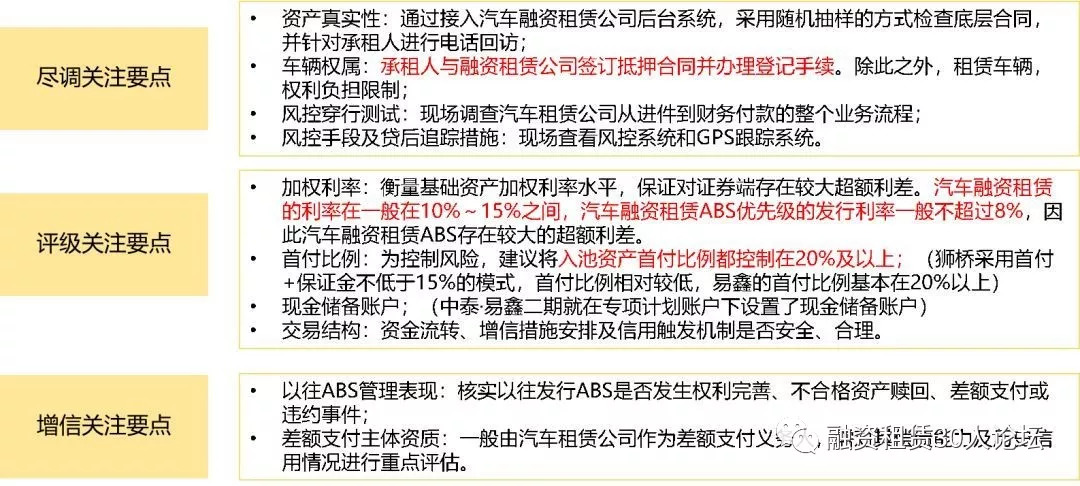 3.2 汽車融資租賃ABS進場關注點 汽車融資租賃ABS的基礎資產為租賃債權,也就是汽車融資租賃公司依據租賃合同對承租人享有的租金請求權和其他權利及其附屬擔保權益,這類資產具有分散度高、安全性好的特質。融資租賃公司單筆汽車融資租賃業務的規模占比很小,對單個客戶的授信一般會設置上限,對授信較大的客戶風控審批更加嚴格。