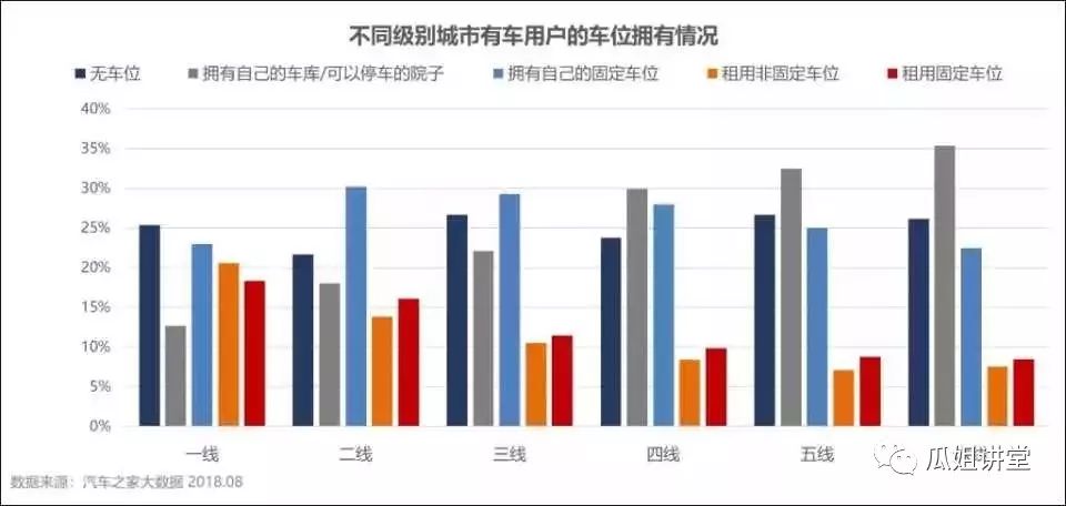 汽車之家大數據也顯示,在一線城市,車主中擁有個人固定車位/車庫/院子的僅占約35%,但在五六線城市,有超過6成的車主有自己的固定停車點。
