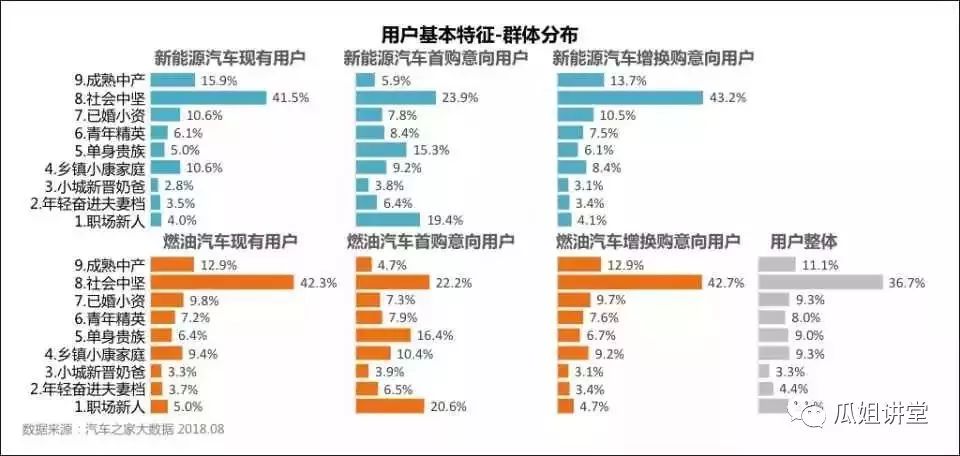 而且在工作職位上,新能源汽車用戶也較燃油汽車用戶更高,此外,“成熟中產”、“鄉鎮小康家庭”、“已婚小資”的用戶群體也大于傳統燃油車用戶。