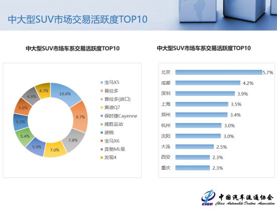 中型車市場中,雅閣、凱美瑞仍然是交易最活躍的二手車。豪華品牌奧迪A4L、寶馬3系、奔馳C級的交易活躍度都名列前茅,豪華品牌與主流合資品牌瓜分了這一細分市場。從地區分布來看,成都、上海、北京的活躍度較高,但北京地區本月的下降幅度較大。鄭州和武漢這兩個中部地區的中心城市,本月活躍度有所提高。