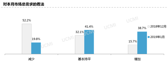 調(diào)查顯示,2019年1月份庫存量相比2018年12月減少。其中認為庫存量“減少”的比例為54.1% ,“增加”的經(jīng)銷商比例為4.5%;認為庫存周轉(zhuǎn)時間“基本持平”的經(jīng)銷商比例為52.3%,“減少”的比例為45.9%,“增加”的比例為1.8%。