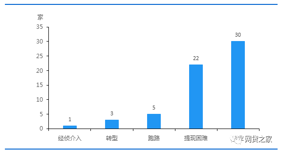 具有背景以及已上線銀行存管的停業(yè)及問題平臺(tái)近半數(shù)選擇良性退出。如下圖所示,有30家平臺(tái)停業(yè),占總數(shù)的49.18%;其次是提現(xiàn)困難的平臺(tái)有22家;轉(zhuǎn)型平臺(tái)有3家;跑路和經(jīng)偵介入的分別有5家和1家。