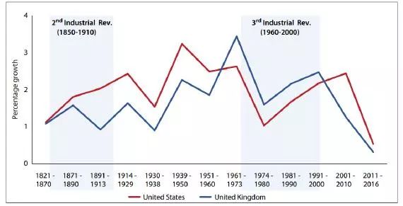 圖5 1821-2016年期間英國和美國勞動生產力年增長率