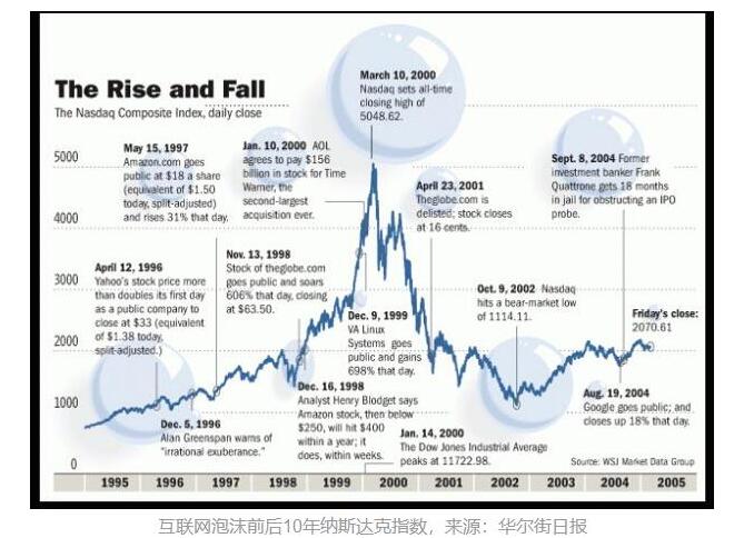 從1995年到2000年,互聯網企業大量誕生,那個最具代表性的互聯網公司是雅虎。從1995年到2000年,納斯達克指數從1000點持續漲到了5048.62點。那時候對互聯網投機的狂熱與今天對區塊鏈的狂熱如出一轍:全球的資本大量涌入互聯網領域,正如今天有錢人從世界各地飛到舊金山希望進入區塊鏈一樣。