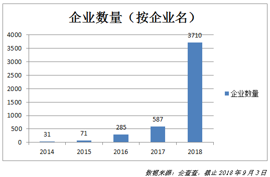 從企查查以企業名查詢獲得的數據來看,2017年中國有587家以區塊鏈命名的公司,而到2018年9月3日,新增了3710家區塊鏈企業,是去年全年的6倍多,并且超過2014年至2016年總數的3倍多。